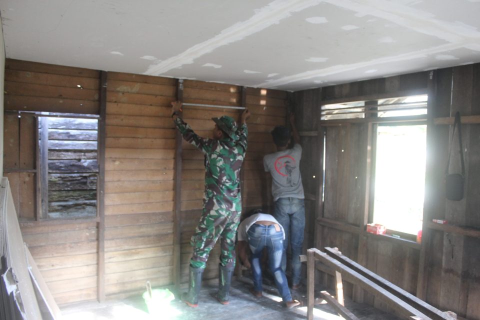 Personil Satgas TMMD bersama masyarakat tampak bahu-membahu mengerjakan pembangunan RTLH, dengan suasana kerja yang penuh kebersamaan mencerminkan semangat satgas TMMD yang tidak hanya membangun fisik, tetapi juga mempererat hubungan antara TNI dan masyarakat.